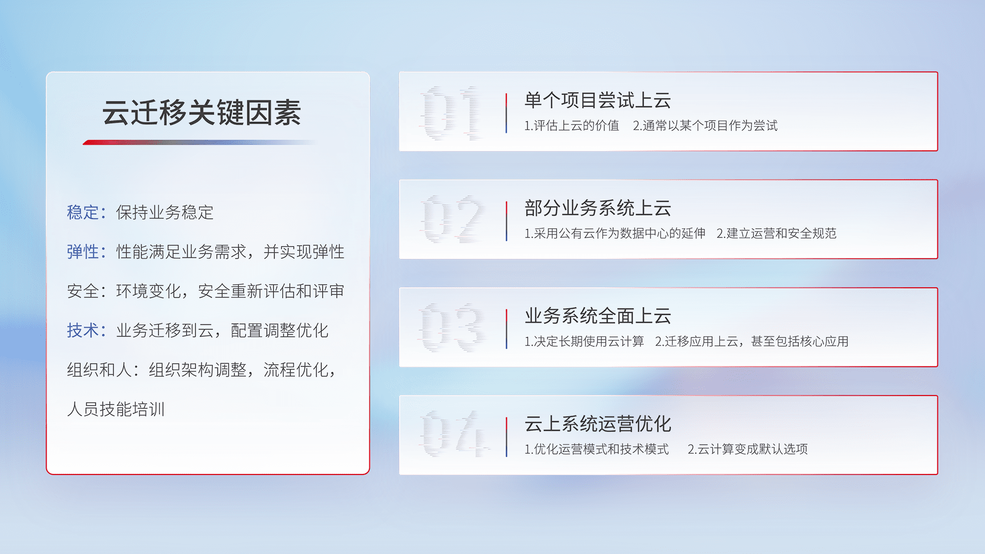 结合实际业务,,,,从规划设计、、云平台选型、、、云原生改造、、数据迁移、、、集成交付,,,迁移全过程为客户识别最佳上云路径,,,,做好风险识别管理,,,,设计网络架构、、、身份权限、、安全审计合规、、操作审计、、日志审计、、监控告警策略、、多站点容灾设计等,,,,对云上基础设施进行整体规划,,,提升IT治理水平,,,,以满足弹性、、、、高可用、、高性能的需求。。