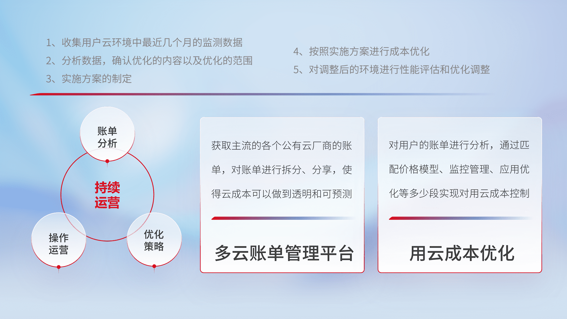 通过多云纳管,,以统一的资源数据模型把客户的云资源进行抽象和封装,,,进而实现对多云资源的统一操作,,,,保障云资源管理的可靠性、、、、稳定性与可用性。。。。量身定制化运维内容,,配置、、开发运维、、、补丁管理、、、备份、、、监控、、认证和访问管理、、、审计和日常巡检等,,,,保障在用云过程中的可靠度,,稳定度以及高可用率。。
